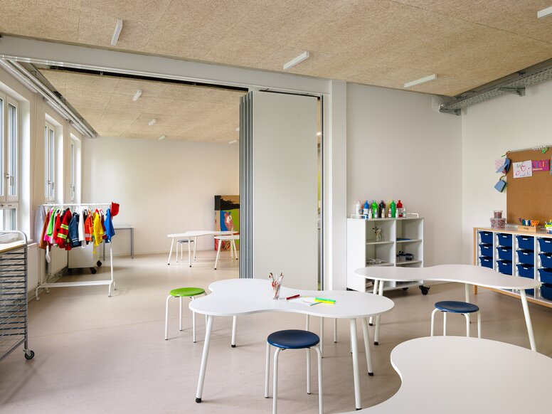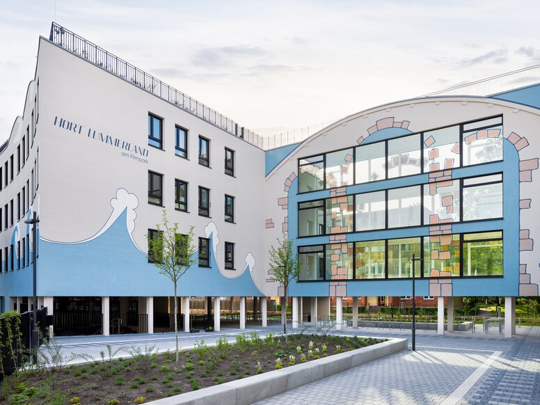 Die Lernräume selbst sind zurückhaltend gestaltet, um die Konzentration zu fördern. Die breiten, flexibel gestaltbaren Flure beherbergen die Garderoben und bieten offene Rückzugsbereiche zum Lernen und Forschen. Im Erdgeschoss befinden sich der großzügige Eingangsbereich und die Mensa, die durch ihre Lage im öffentlich zugänglichen Bereich des Schulgebäudes auch außerhalb der Schulzeiten genutzt werden kann. Im 3. Obergeschoss des Horts lässt sich eine offengestaltete Fläche zur Aula umfunktionieren, die auch für größere Schulveranstaltungen genutzt werden kann. Die variablen Grundrisse prägen das neue Gebäudeensemble auf allen Ebenen und sind auch im Hinblick auf die Barrierefreiheit von großer Bedeutung.