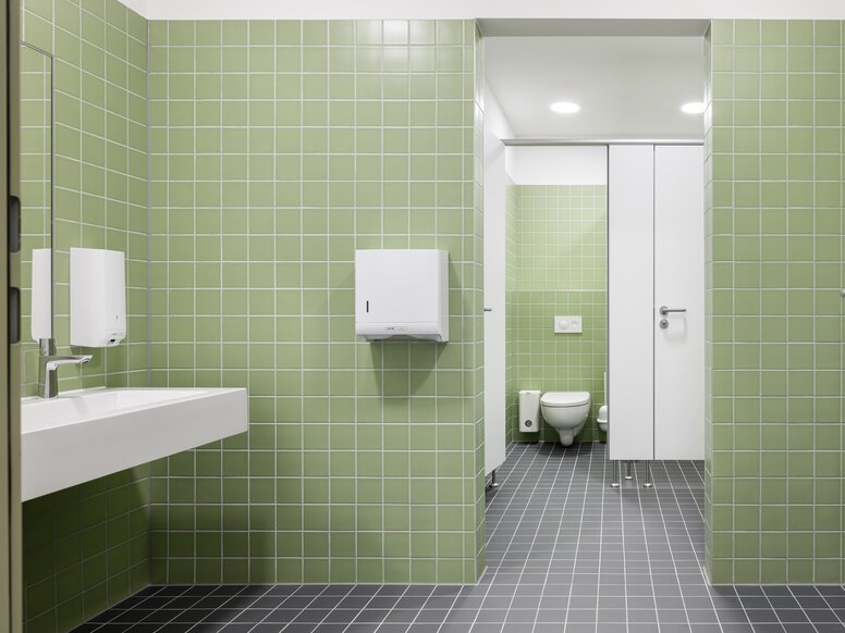Aber auch im Detail wird Wert auf Barrierefreiheit gelegt. So entschied man sich in den Bädern für die Serie 801 von HEWI, die sich im Segment der barrierefreien Sanitärausstattung längst als Marktführer etabliert hat. „Für uns war es wichtig, dass die in der Michael-Ende-Grundschule eingesetzten Produkte ganz im Sinne des Universal Designs den Bedürfnissen aller Menschen gerecht werden und dabei höchste Qualität mit Funktionalität und ästhetischem Anspruch verbinden“, begründet Nadya Faris-Bibawi, Architektin und Geschäftsführerin des Büros NOKERA Planning, die Entscheidung für HEWI. In der Ausführung Reinweiß harmonieren die HEWI Lösungen mit den Fliesenwänden in den Leitfarben Gelb, Grün, Blau und Rot und setzen Akzente zu den anthrazitfarbenen Bodenfliesen.