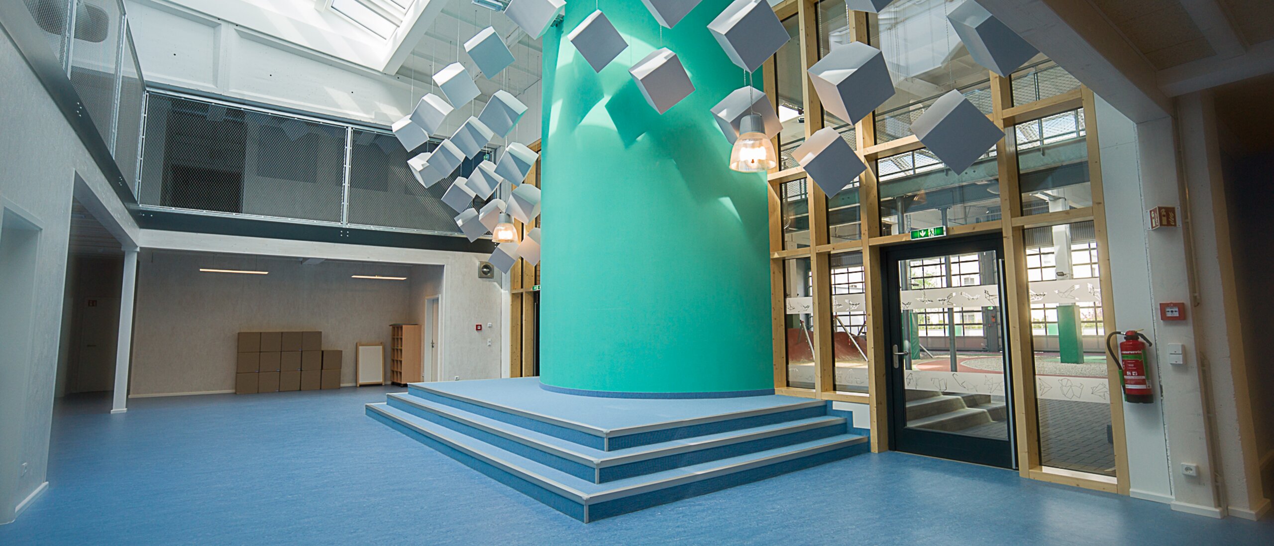 Centrally located in the area between the main building and the indoor area is also the slightly elevated stage. This is used by the day care centre for various events and performances and also offers a spiral staircase suitable for children up to the gallery on the upper floor. This is of course designed to be childproof thanks to a stainless steel mesh.