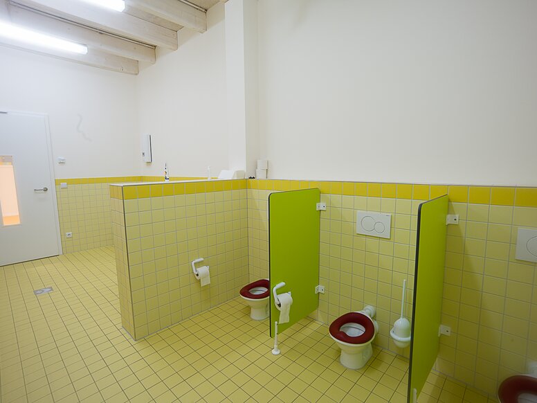 The range of solutions in the KITA in the worsted spinning mill includes washbasins, mirrors, fittings, toothbrush cup holders and accessories such as soap dispensers or toilet roll holders. In the KITA in the worsted spinning mill, barrier-free equipment solutions in the sanitary rooms also help the children to use them.