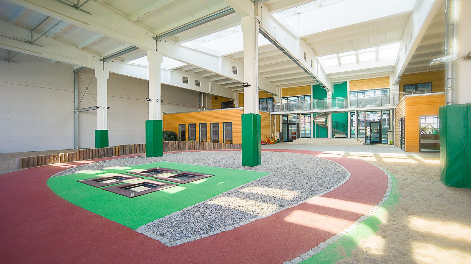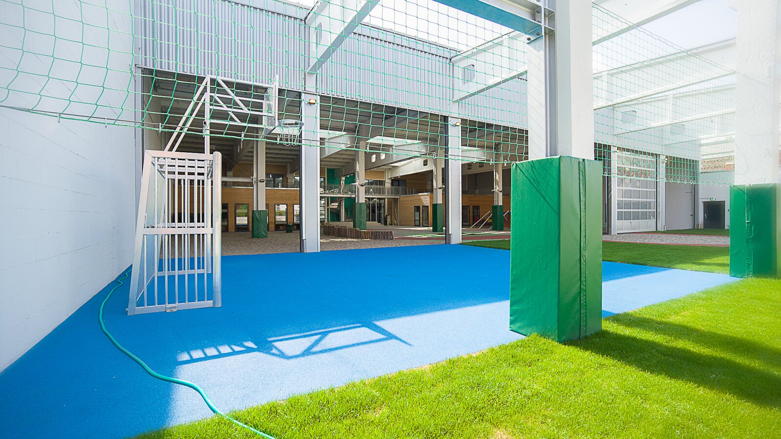 The remaining two-thirds of the total area is occupied by the roofed arcade, which is connected to the outside area by six openable rolling gates. In the indoor play area there are many play and movement possibilities for the little ones: trampolines, climbing wall, sand playground with climbing frame in spider form and an eight-shaped scooter track. When the gates are open, the transition to the outdoor area is smooth and the children can use the natural grass surface and the multifunctional pitch for various sports such as handball, football or basketball.