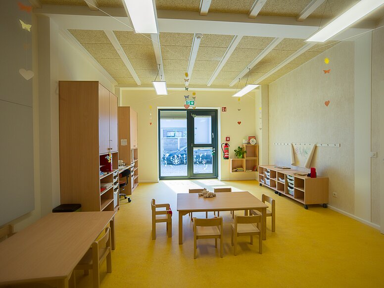The entire facility has many skylights, which provide the daycare centre with sufficient daylight. In good weather they can be opened and on dark days they still keep the area bright enough. The windows help to save electricity, but the nursery is also an energy-saving house in other respects. It has a photovoltaic system on the roof, which supplies the entire building with electricity, heat and hot water. Any surplus energy is sold, generating additional income and minimising running costs.