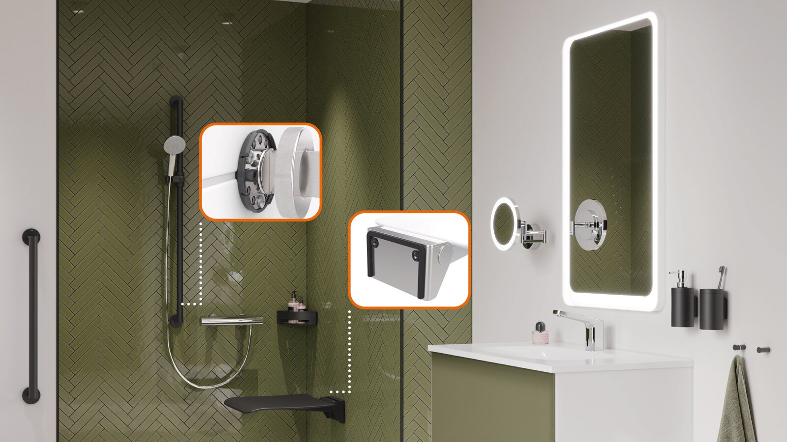 The standard-compliant sealing discs and sealing tape components for bar systems and shower seats are certified by the Institute for Wall and Floor Coverings and offer protection for application areas of water impact class W1-I and W2-I according to DIN 18534-1.