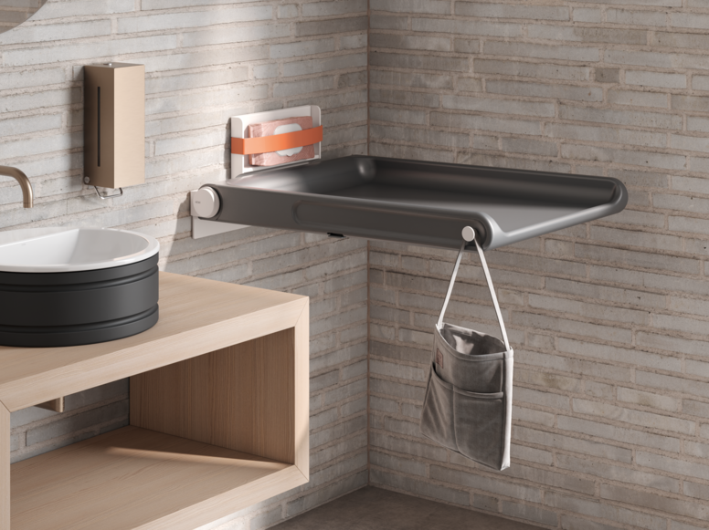 The new HEWI baby changing table combines an easy-to-clean lying surface made of PUR foam in iron grey with robust metal components in matt grain white. The braked fold-down function enables smooth handling, while side hooks and a clamp compartment offer additional comfort and convenience. The changing table combines the highest safety standards and comfortable handling with a modern design that blends seamlessly into public sanitary areas. The baby changing table was designed by Holscher Design, a renowned and award-winning strategic product design agency from Denmark with over 50 years of experience.