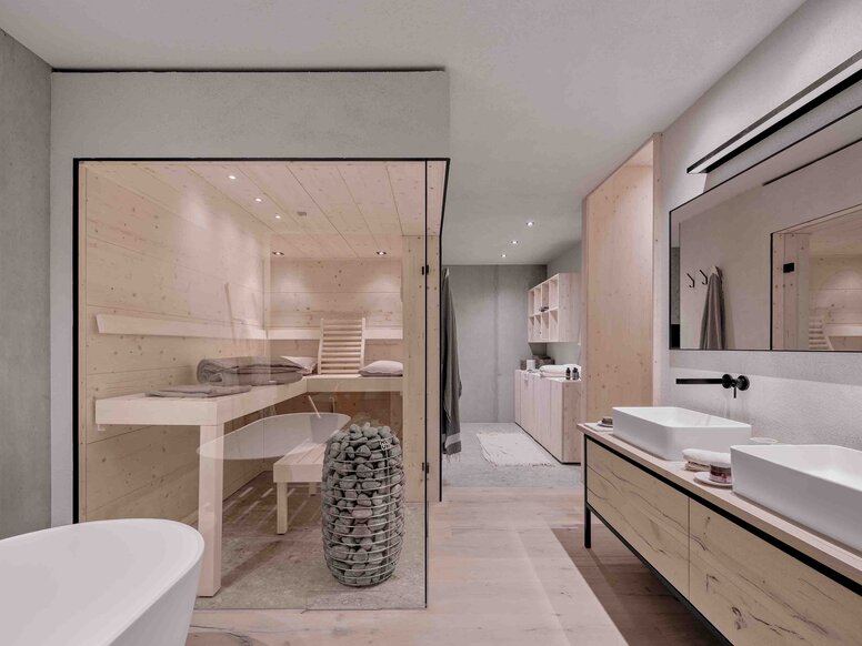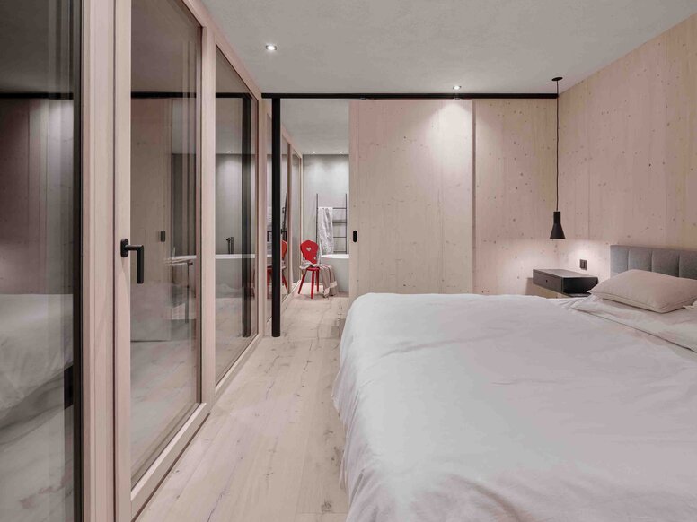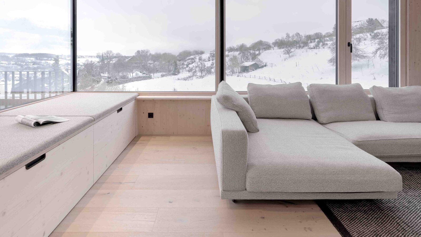 Le concept architectural est basé sur le dialogue des matériaux. Le béton apparent utilisé comme fondation est durable, supporte les charges et est solide. À l’opposé, le bois chaud des étages supérieurs est synonyme de légèreté, d’ouverture et de proximité avec la vie. « Ces contrastes ne sont pas une contradiction, mais la véritable force de la maison », souligne Florian Schönauer. C’est dans ce champ de tensions que se déploie une architecture qui respire à la fois la solidité et la transparence. Des surfaces vitrées de grand format, des percées visuelles placées avec précision et une fenêtre à banquette avec vue panoramique relient étroitement l’espace intérieur avec le paysage. L’intérieur et l’extérieur forment un continuum fluide.