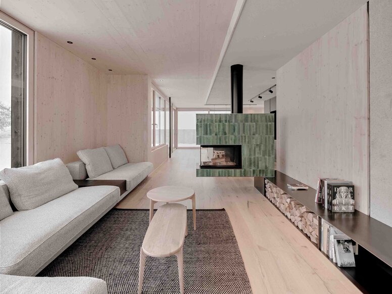 Le terrain se situe à la transition entre une structure villageoise développée et un paysage ouvert. Le terrain monte en pente raide, ce qui crée un composant aussi complexe qu’inspirant. Au lieu de niveler le terrain, l’architecture réagit à la topographie existante : deux étages massifs en béton apparent forment le socle et absorbent les différences de hauteur, abritent les espaces de desserte et fonctionnels et transmettent, par leur présence introvertie, un sentiment d’attachement à la terre et de calme. Sur cette base viennent se poser deux étages tout en légèreté construits en bois massif contreplaqué (BSP/CLT) qui s’ouvrent sur l’environnement. « Il ne s’agit pas d’opposer quelque chose au paysage, mais d’absorber sa force », explique Florian Schönauer. Il en résulte un échelonnement clair de l’espace : le bas, discret et protégé, le haut, ouvert, lumineux et offrant une vue panoramique.