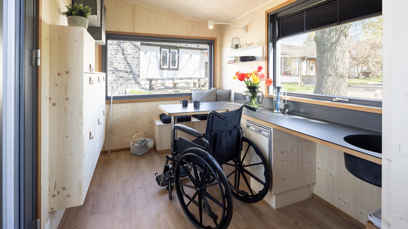 Christian Bock: Het was voor ons bijzonder belangrijk dat het Tiny Rolli House wel rolstoeltoegankelijk is, maar dat toch de charme van een tiny house behouden gebleven is. Een 'verpleeghuis'- of 'ziekenhuis'- tintje was in ieder geval niet de bedoeling. Maar de belangrijke functionaliteit moet wel aanwezig zijn, zodat Jens zich zelfstandig door het tiny house kan bewegen. Dan gaat het onder meer om wandsteunen en een douchezitje in de badkamer. Wij wilden het accent niet op zijn beperkingen leggen, maar hem gewoon zo goed mogelijk ondersteunen. Het Tiny Rolli House moet een positieve invloed hebben op de bewoners. Het uiterlijk en de vormtaal mogen niet worden verwaarloosd. Een bijzonder kenmerk van het huis is zeker de oprijplaat, een helling die rolstoelgebruikers in staat stelt het Tiny House comfortabel te bereiken. Voor een goede grip van de banden hebben we een designvloer gelegd. Een uittrekbare koelkast, een verwarmde tafelconstructie waar de rolstoel onder gereden kan worden, met een gootsteen en fornuis binnen handbereik zorgen voor het gewenste wooncomfort. Het kleine woonoppervlak is zelfs een voordeel gebleken voor Jens Conrad: hij heeft de belangrijkste dingen allemaal bij elkaar, hij hoeft zich alleen maar om te draaien. Vanuit zijn bed kan hij zich rechtstreeks op het toilet trekken, zonder zijn rolstoel te gebruiken.