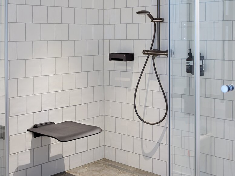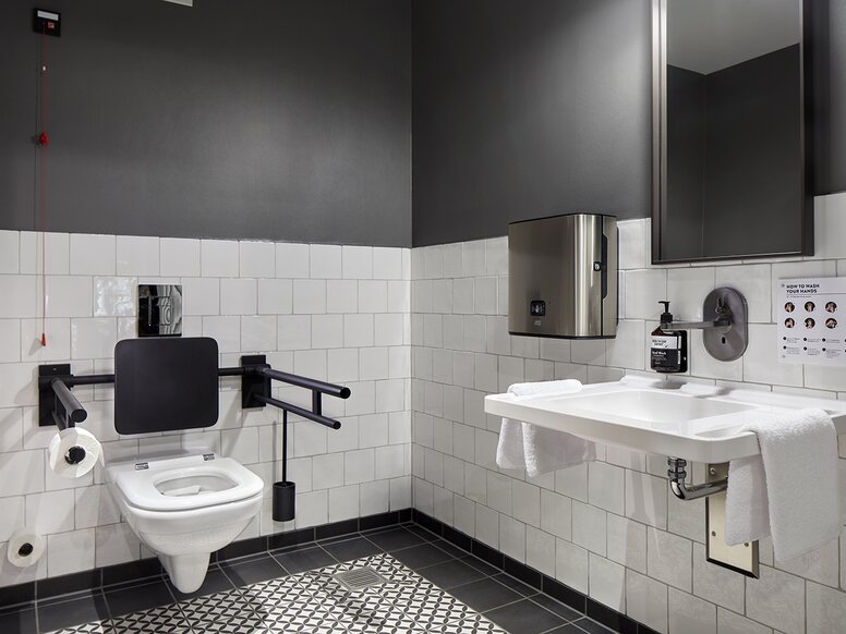 De HEWI-producten van Systeem 900 met een elegante donkere poedercoating passen bij het industriële design van rode baksteen en matzwarte elementen van het interieurontwerp en maken een stijlvolle vormgeving van toegankelijke badkamers in hotels mogelijk.