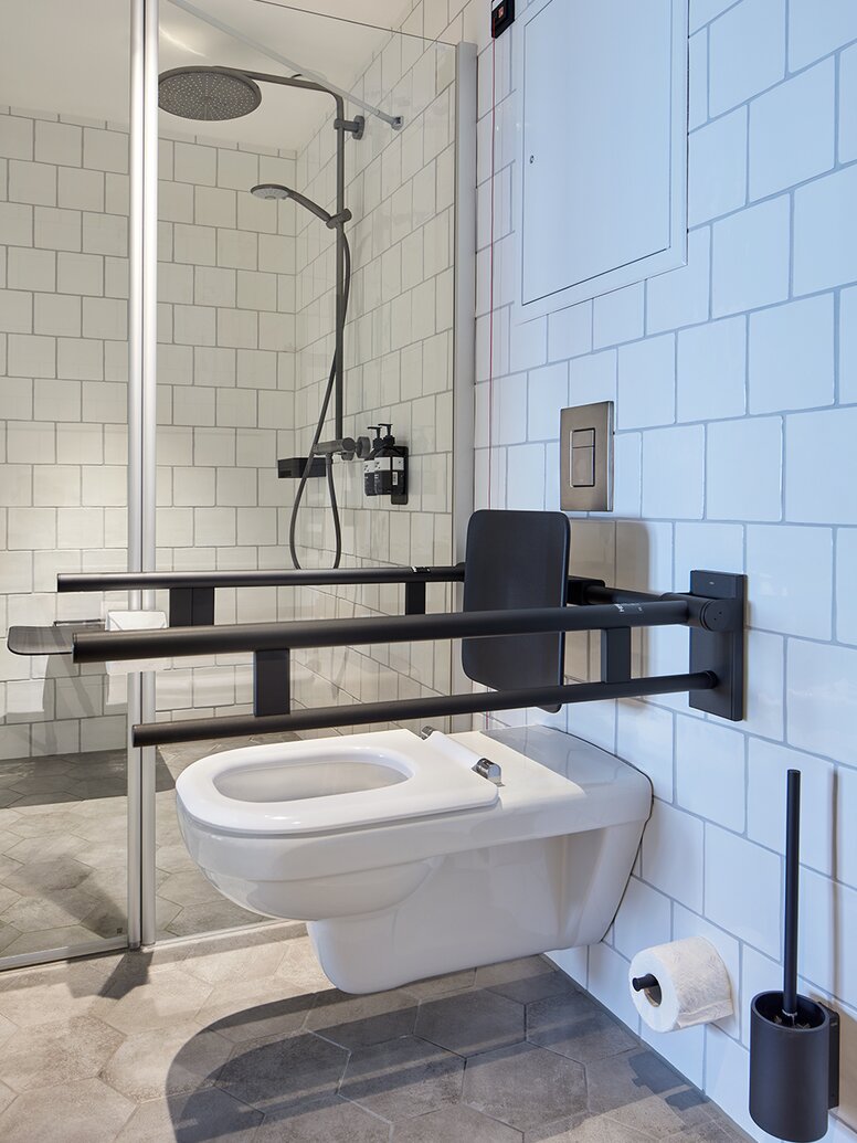 Zwarte bouw- en designelementen lopen als een rode draad door het ontwerp van het hotel. HEWI System 900 oplossingen integreren harmonieus in hotelbadkamers en barrièrevrije sanitaire ruimtes.