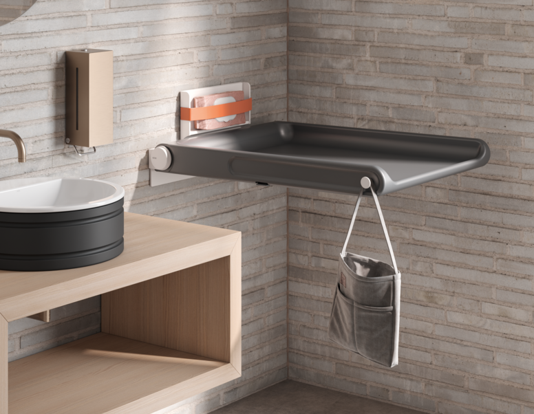 De nieuwe HEWI babyverschoontafel combineert een makkelijk te reinigen ligoppervlak van PUR-schuim in ijzergrijs met robuuste metalen componenten in korrelwit mat. De geremde neerklapfunctie maakt soepel gebruik mogelijk, terwijl zijhaken en een klemvak extra gemak bieden. De verschoontafel combineert de hoogste veiligheidsnormen en gebruiksgemak met een modern ontwerp dat naadloos past in openbare sanitaire ruimtes. De babyverschoontafel is ontworpen door Holscher Design, een gerenommeerd en veelvuldig bekroond bureau voor strategisch productontwerp uit Denemarken met meer dan 50 jaar ervaring.