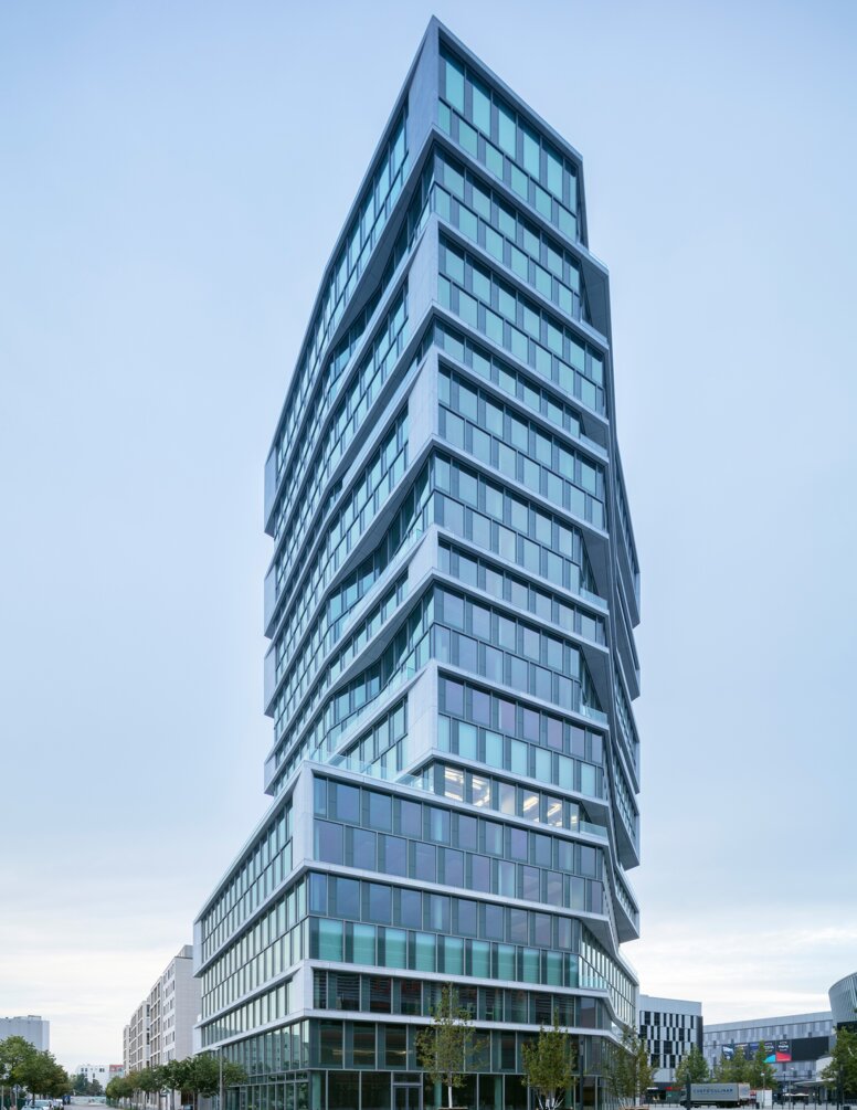 Ze swego rodzaju szklanego cokołu o siedmiu kondygnacjach, wieża przesuwa się 97,5 metra w kierunku nieba, z naprzemiennym przesunięciem piętro po piętrze, tworząc „interesującą, miejską rzeźbę”, jak to określa Gewers Pudewill. Dynamiczne wystające i cofnięte elementy w elewacji tworzą duże balkony i tarasy na wszystkich poziomach. Meandrujące, poziome pasma odsłoniętego betonu nadają budynkowi strukturę i stanowią ciekawy akcent. Szklana powłoka ukazuje wieżę w innym świetle z każdego kierunku patrzenia i w zależności od położenia słońca, podkreślając tym samym jej żywą i wielowarstwową kubaturę.