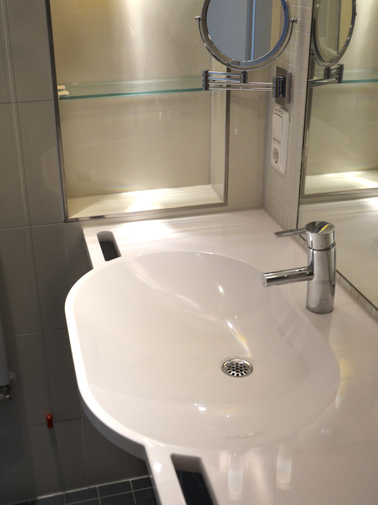Wysokiej jakości wyposażenie nadaje również łazienkom w opcjonalnej strefie serwisowej przyjemną atmosferę. Produkty bez barier integrują się z wzornictwem. Umywalka, którą można wjechać pod nią, może być używana zarówno na stojąco, jak i wygodnie w pozycji siedzącej i nie jest rozpoznawalna na pierwszy rzut oka jako produkt bez barier. Zintegrowane uchwyty zapewniają bezpieczne trzymanie i ułatwiają wstawanie: duża powierzchnia magazynowa oferuje dużo miejsca na naczynia łazienkowe. W umywalce celowo pominięto przelew, a nieporowata powierzchnia ułatwia czyszczenie i zwiększa higienę.