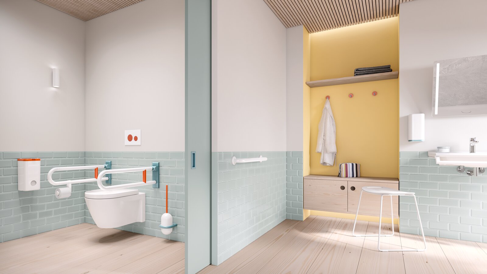 Do wyposażenia przedszkoli i szkół podstawowych dostępne są dwie różne kombinacje kolorystyczne HEWI Serii 477/801. Dzięki naturalnie wyglądającym odcieniom jabłkowej zieleni, majowej zieleni, koralu i niebieskiego aqua, a także stalowego błękitu, HEWI oferuje dwie opcje projektowe, które sprawiają, że szkoły, przedszkola czy świetlice zyskują na atrakcyjności.