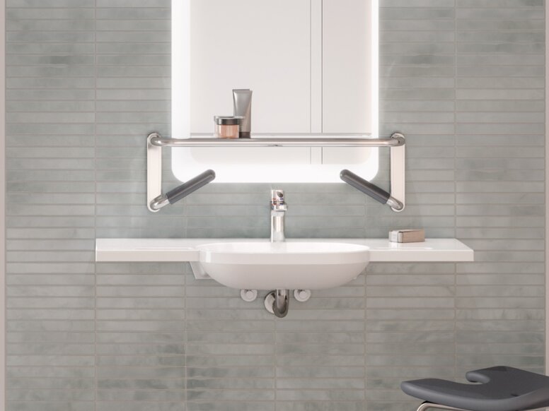Lustro ze zintegrowanymi uchwytami zapewnia bezpieczeństwo. Za ich pomocą pacjent może samodzielnie stanąć przed umywalką i pozostać stabilnie zarówno w pozycji siedzącej i stojącej. Uchwyty wykonane są z wysokiej jakości poliamidu, który jest szczególnie przyjemny w dotyku.