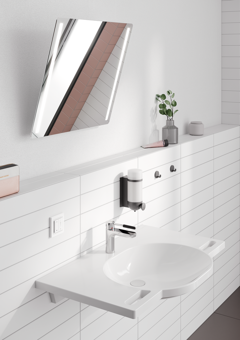 Lustro uchylne z silnikiem rozszerza istniejącą gamę ręcznych luster uchylnych. Wyposażone w silnik elektryczny, sterowanie funkcją pochylania następuje do maksymalnie 28° za pomocą dowolnie pozycjonowanego bezprzewodowego przełącznika ściennego. Podobnie jak w przypadku ręcznie obsługiwanych luster uchylnych, użytkownicy mogą również wybrać wersję bez podświetlenia lub z podświetleniem. Oddzielny bezprzewodowy przycisk służy do włączania i wyłączania oświetlenia oraz do płynnej regulacji jasności i barwy światła - od ciepłej bieli do zimnej bieli.