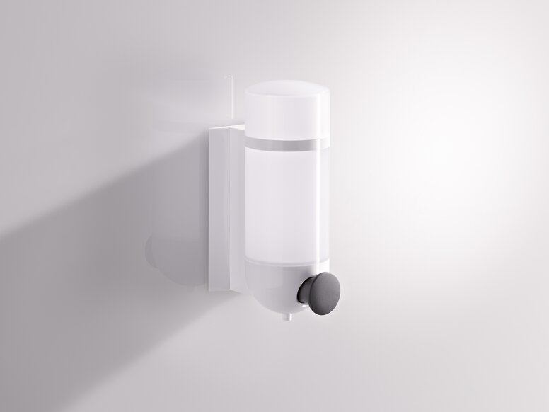 W dozowniku mydła, tylko przycisk do uruchamiania jest wyraźnie zaznaczony kontrastem kolorystycznym. Lekko chropowata powierzchnia przycisku sprawia, że ten element funkcyjny jest również wyczuwalny dotykowo.