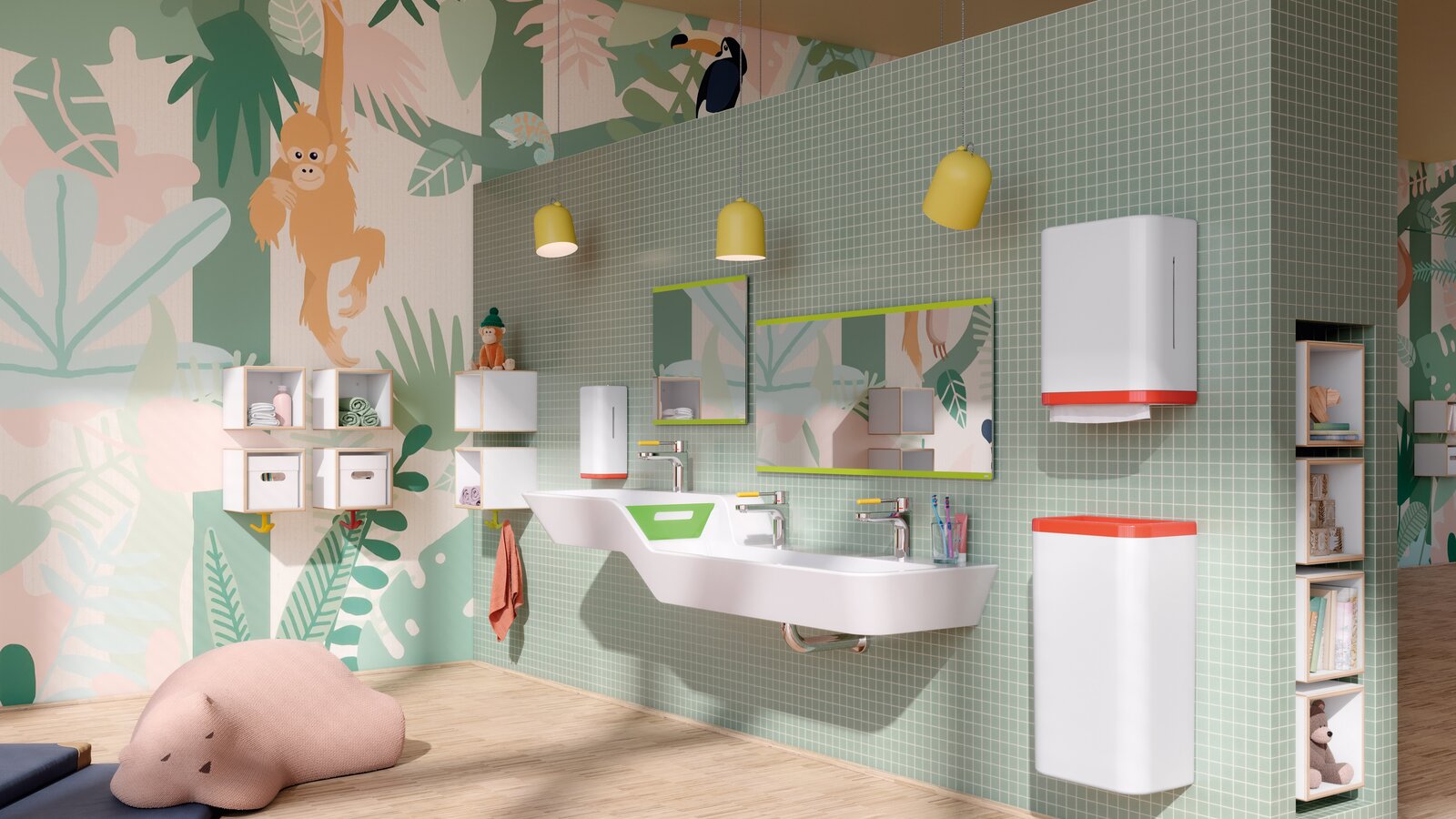 Istnieją również produkty przeznaczone dla dzieci: Umywalki dla dzieci HEWI zachwycają delikatnymi promieniami skoncentrowanymi na bezpieczeństwie najmłodszych. Poza umywalkami, asortyment obejmuje również lustra. HEWI spełnia tym samym wymogi dotyczące rozwiązań produktowych dla przedszkoli, żłobków i szkół. Oprócz umywalek pojedynczych i podwójnych, dostępne są również umywalki rzędowe regulowane na wysokość. Oprócz klasycznej bieli, HEWI oferuje dwukolorową wersję w wesołej jabłkowej zieleni lub jasnym błękicie cyjanowym);